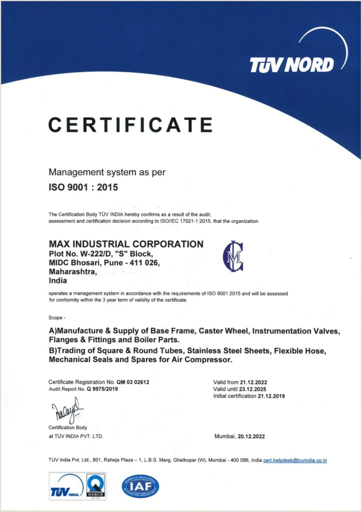 At Max Industrial Corporation, we are committed to excellence in manufacturing and trading, a fact underscored by our prestigious ISO 9001:2015 certification, awarded by TÜV NORD. This certification reflects our dedication to maintaining a world-class quality management system across all operations.